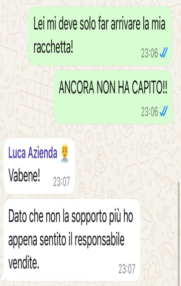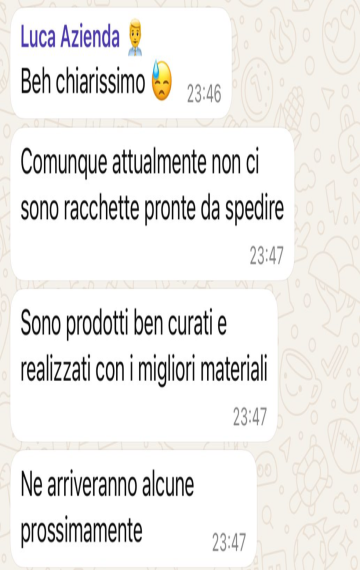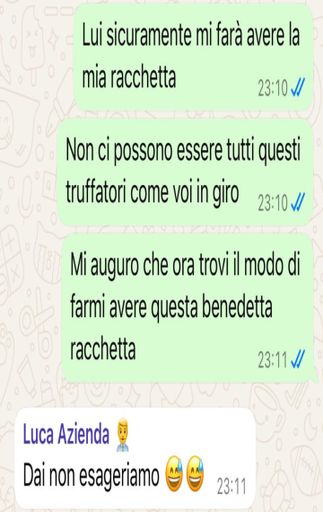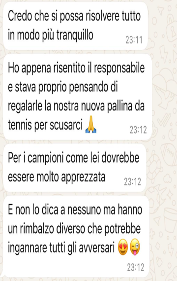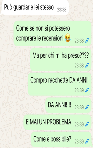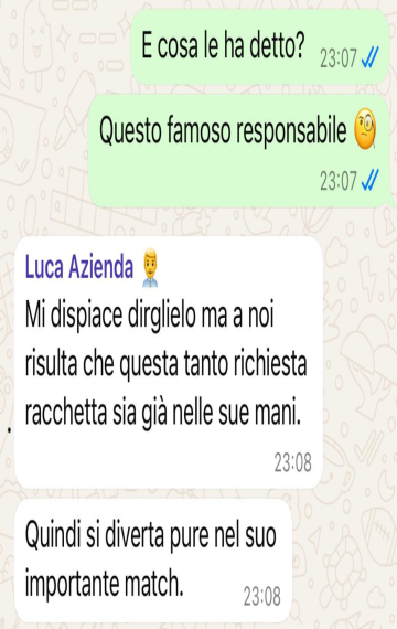 "La mia racchetta non è mai arrivata, non hanno colto l'ironia forse ma alla fine il loro avvocato voleva rispondermi. In poche parole abbiamo capito che non c'era sintonia e che questo ordine non è arrivato. Sembra uno scherzo, ma è tutto vero. La racchetta da tennis comunque non si è vista"