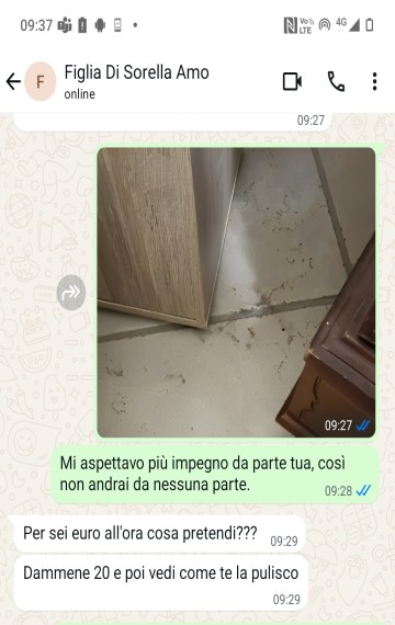 "Ora che rileggo la chat, a dire il vero, avrei dovuto immaginarlo che mia nipote non era la persona giusta per pulirmi casa. Basta vedere quanto sono stropicciati i suoi vestiti. La storia è questa: avevo invitato degli amici per cena, ma tra lavoro e palestra erano settimane che non davo una pulita in casa. Il problema è che non avevo soldi per chiamare una donna delle pulizie, così per risparmiare ho chiesto aiuto a mia sorella. Non lo avessi mai fatto! Mi ha mandato mia nipote, e guarda come è finita. Alla fine ho dovuto pulire casa da capo e come se non bastasse mia sorella si è infuriata con me per quello che ho scritto a mia nipote il giorno dopo. Volevo solo insegnarle un po' di educazione. Si riduce sempre ad una questione di soldi e sindacato. Non esistono più il favoreggiamento di una volta."
