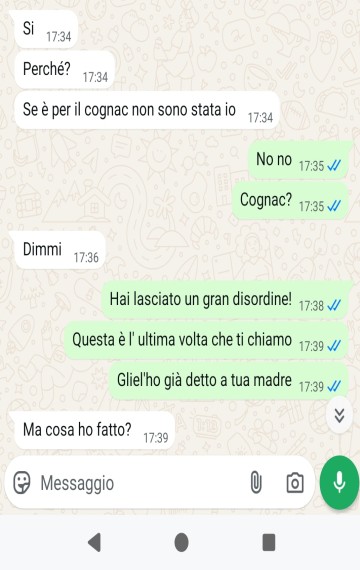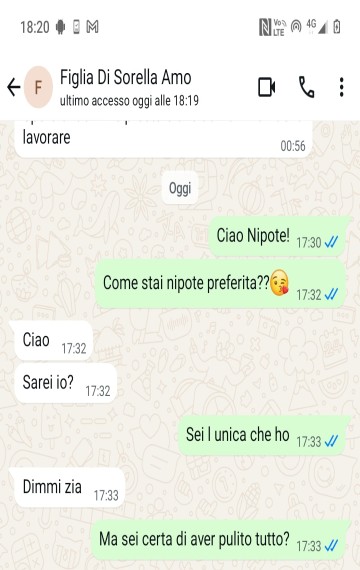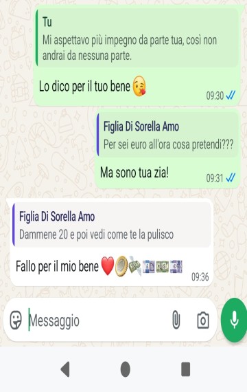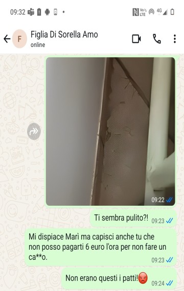 "Ora che rileggo la chat, a dire il vero, avrei dovuto immaginarlo che mia nipote non era la persona giusta per pulirmi casa. Basta vedere quanto sono stropicciati i suoi vestiti. La storia è questa: avevo invitato degli amici per cena, ma tra lavoro e palestra erano settimane che non davo una pulita in casa. Il problema è che non avevo soldi per chiamare una donna delle pulizie, così per risparmiare ho chiesto aiuto a mia sorella. Non lo avessi mai fatto! Mi ha mandato mia nipote, e guarda come è finita. Alla fine ho dovuto pulire casa da capo e come se non bastasse mia sorella si è infuriata con me per quello che ho scritto a mia nipote il giorno dopo. Volevo solo insegnarle un po' di educazione. Si riduce sempre ad una questione di soldi e sindacato. Non esistono più il favoreggiamento di una volta."